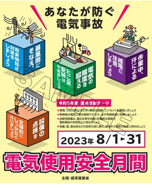 毎年8月「電気使用安全月間」活動の一環として、電気使用安全月間の周知と電気安全を呼び掛けるため『電気使用安全月間ポスター』を製作・発行しております。当ポスターを電気安全PRにご活用いただければ幸いです。